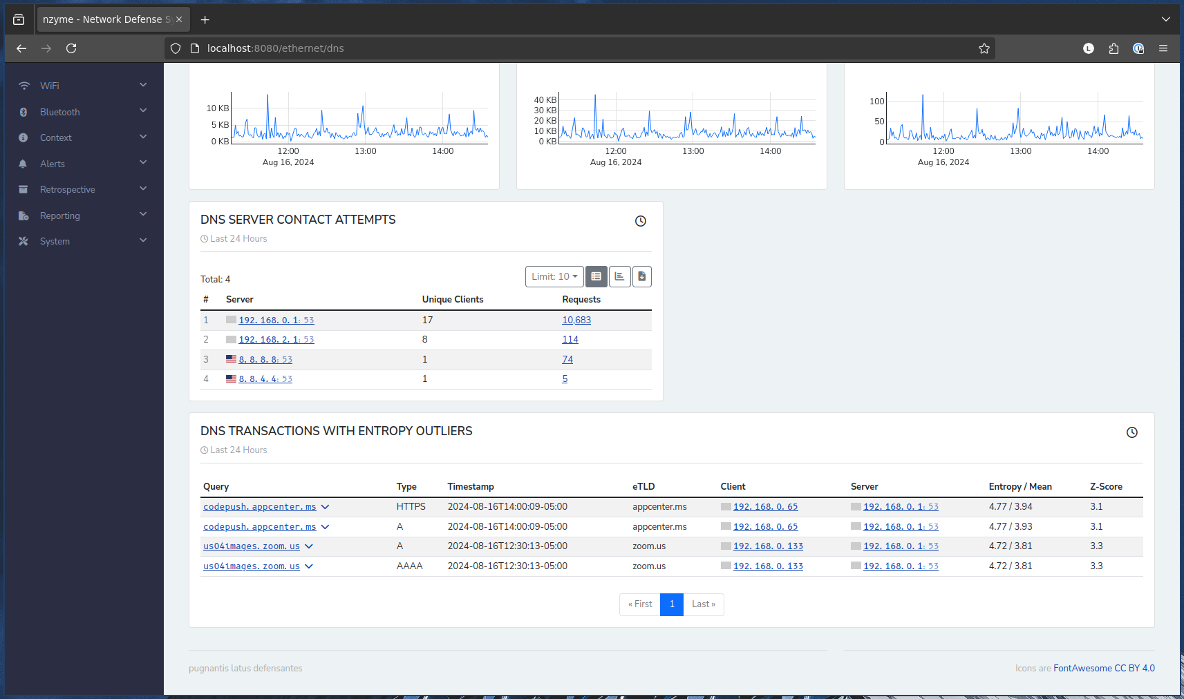 By analyzing the entropy of DNS queries and responses, nzyme can identify outliers—those with unusually high entropy values. These outliers may suggest that the DNS traffic is being used for purposes other than standard domain name resolution, such as tunneling.